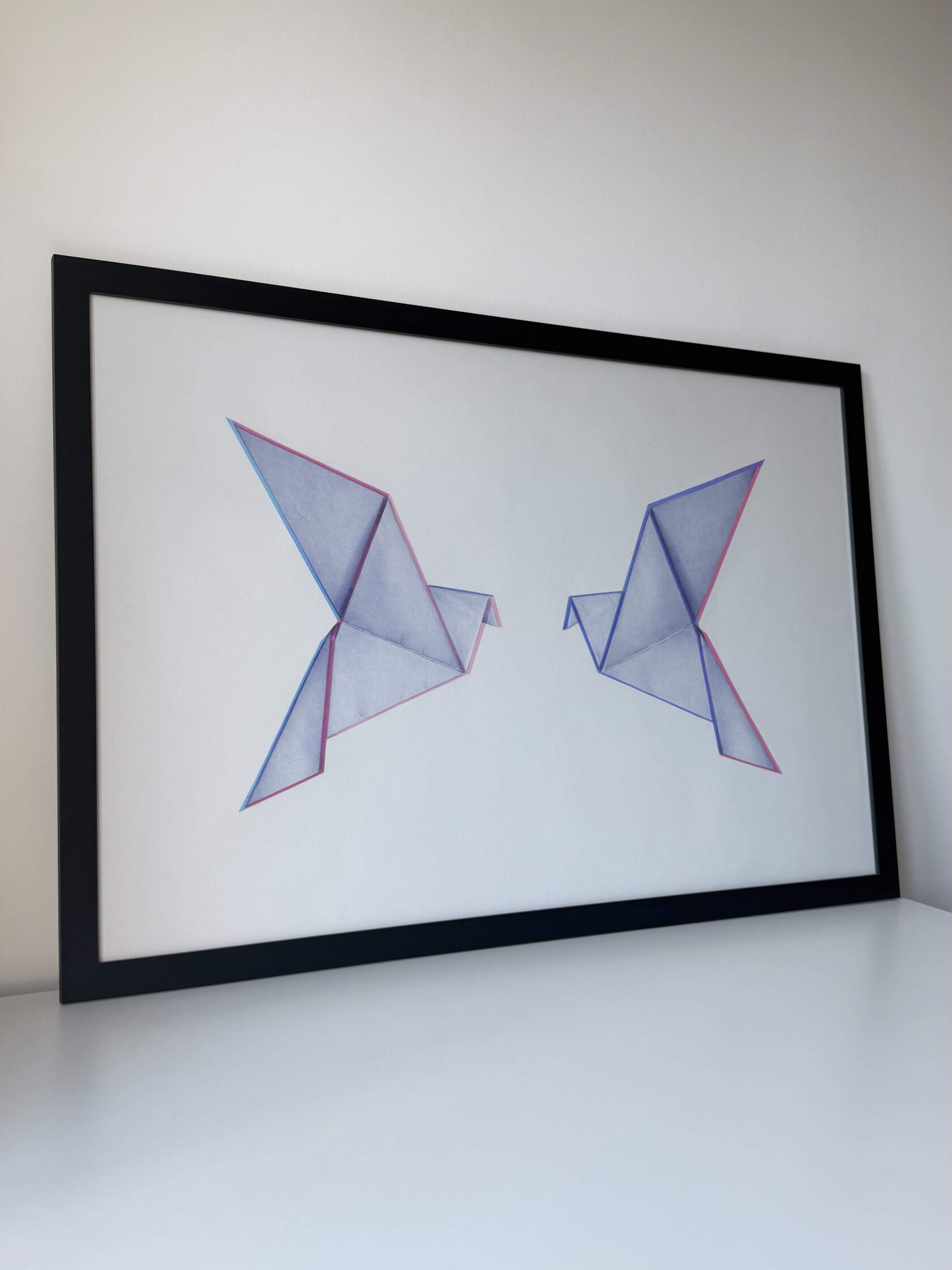 "Лис" Оригами лиса сложено из страницы сказки Антуана де Сент-Экзюпери «Маленький Принц», где Принц встречает Лиса и приручает его. 60х42см Работа выполнена синей шариковой ручкой на бумаге плотностью 200г/м2. 2023г Оформлена в белую раму.