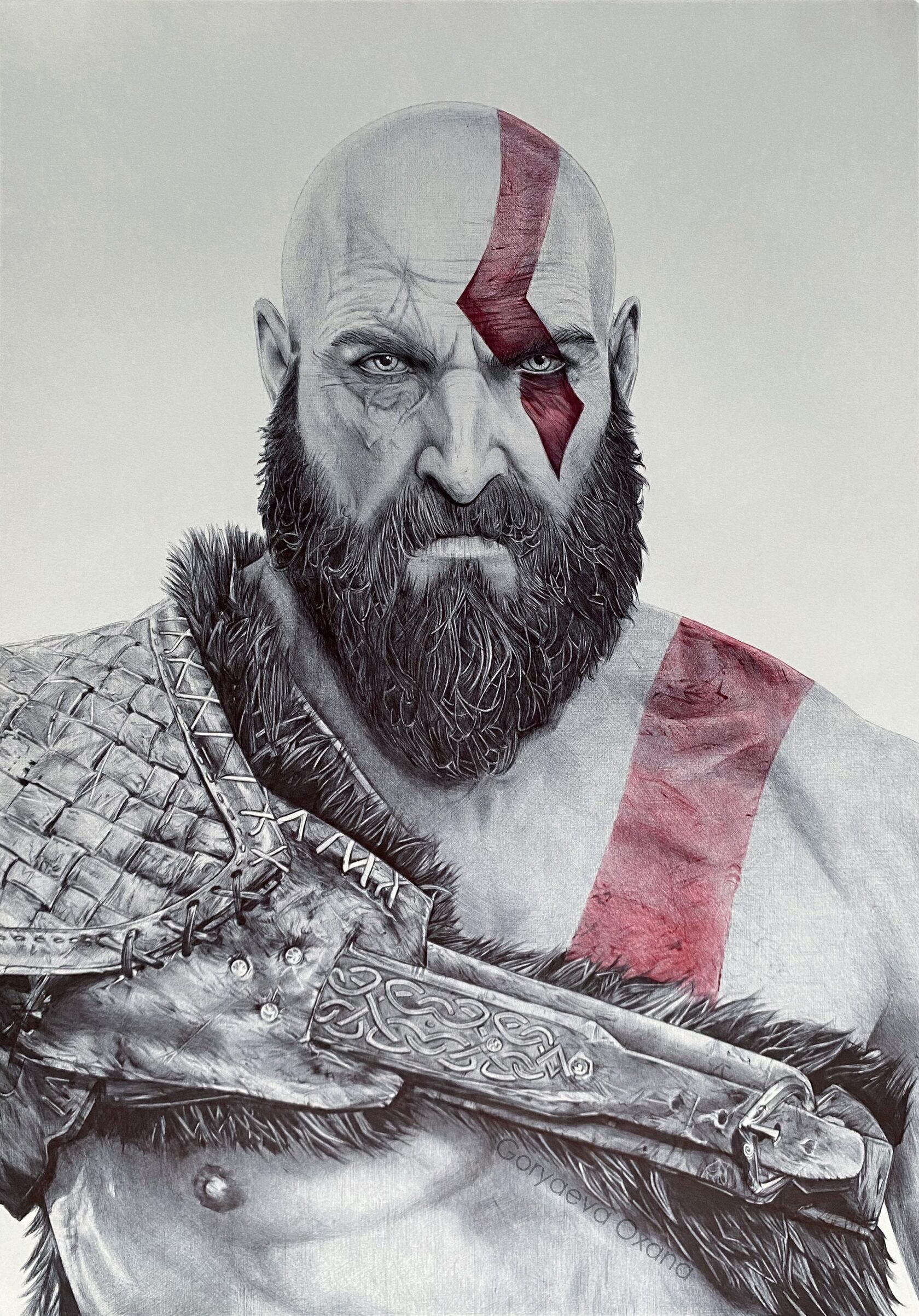 Работа выполнена черной и красной шариковыми ручками на бумаге плотностью 200г/м2.