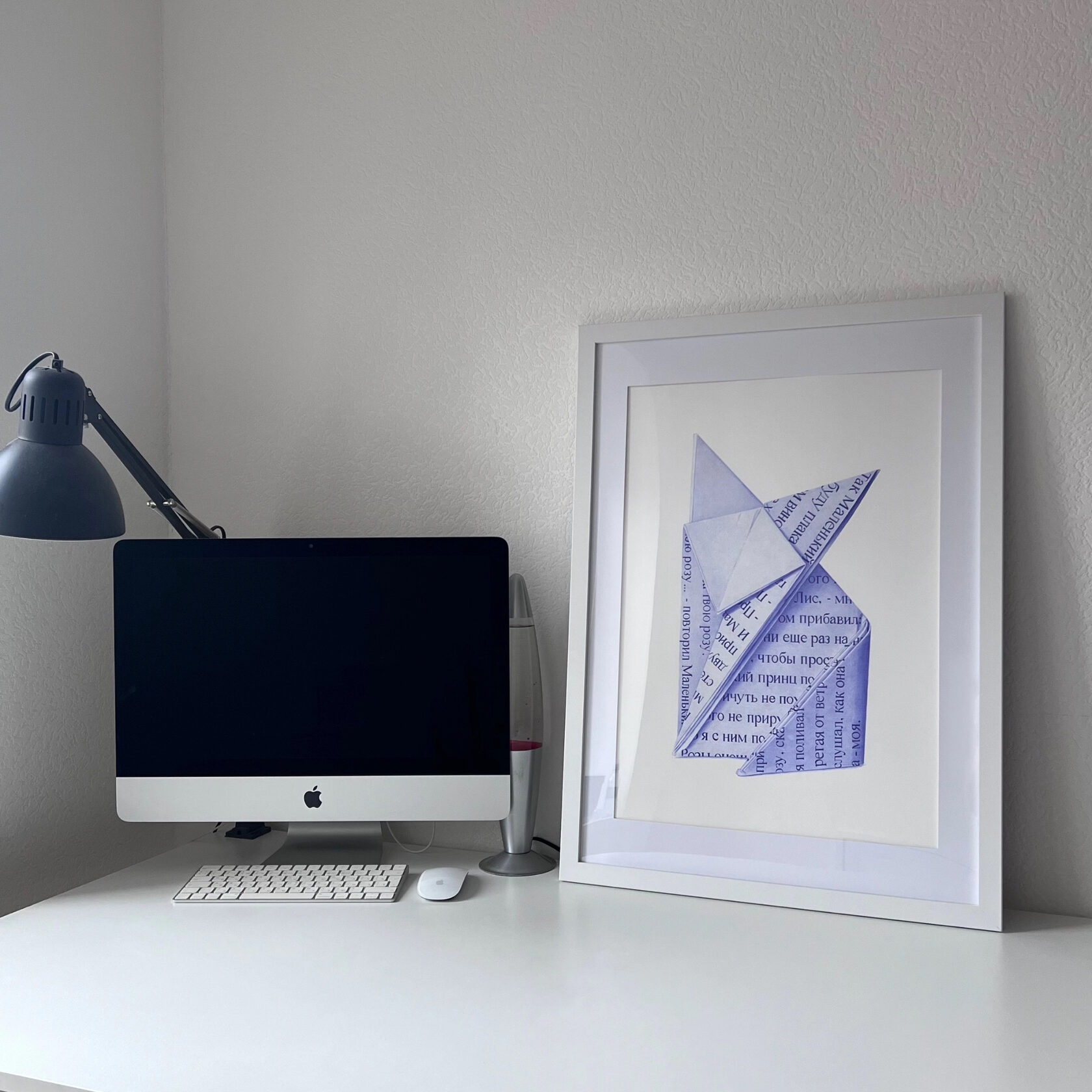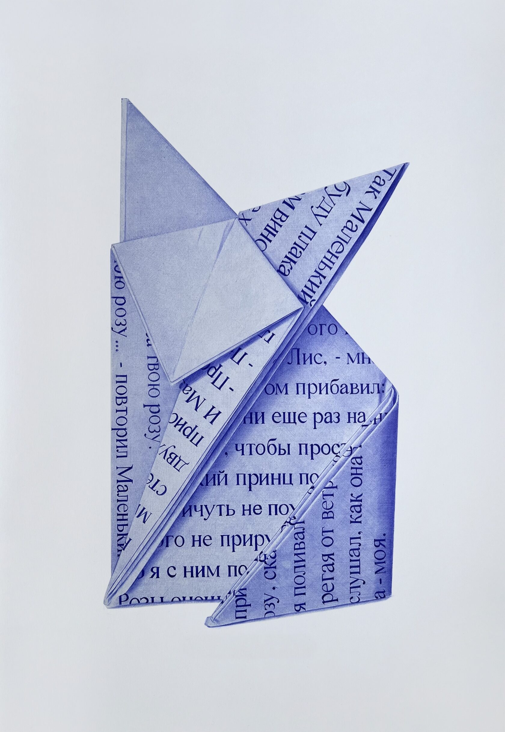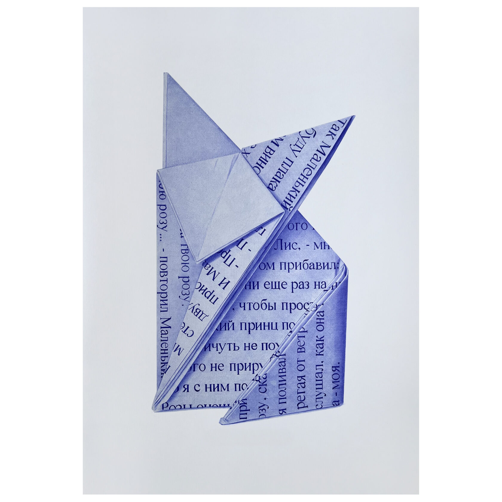 "Лис" Оригами лиса сложено из страницы сказки Антуана де Сент-Экзюпери «Маленький Принц», где Принц встречает Лиса и приручает его. 60х42см Работа выполнена синей шариковой ручкой на бумаге плотностью 200г/м2. 2023г Оформлена в белую раму.