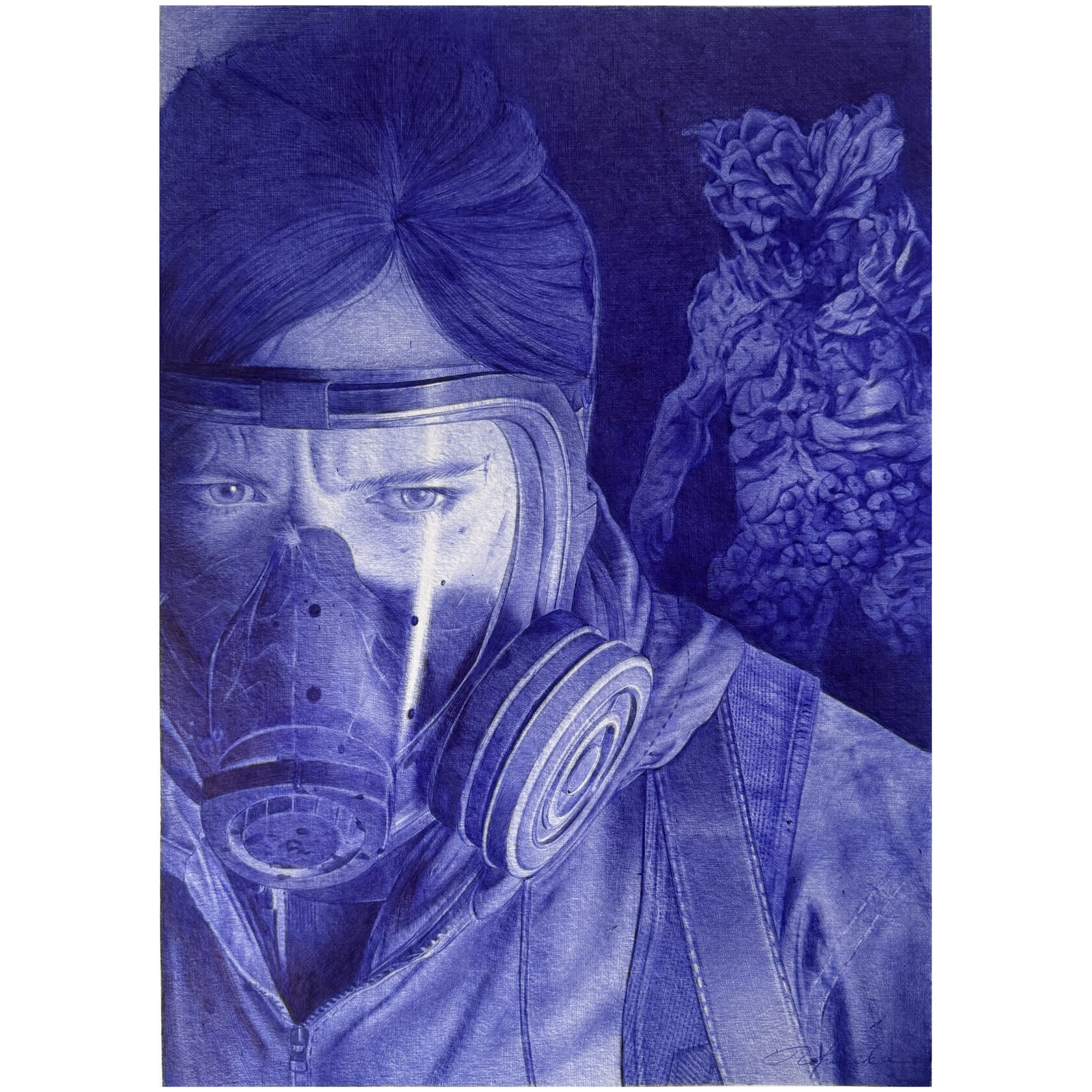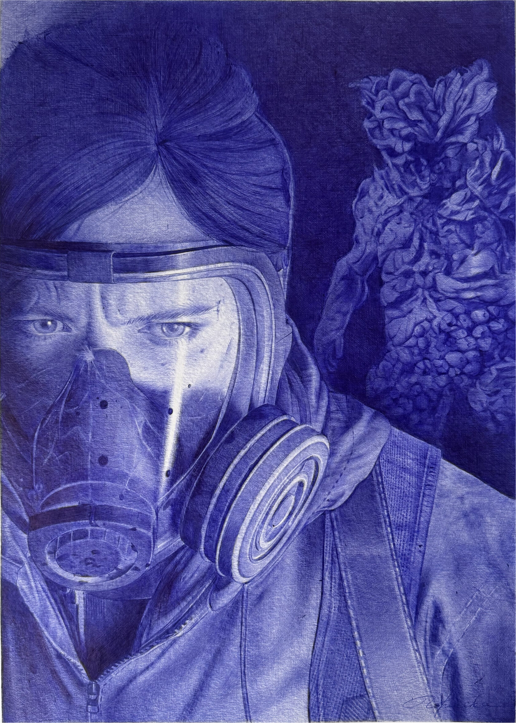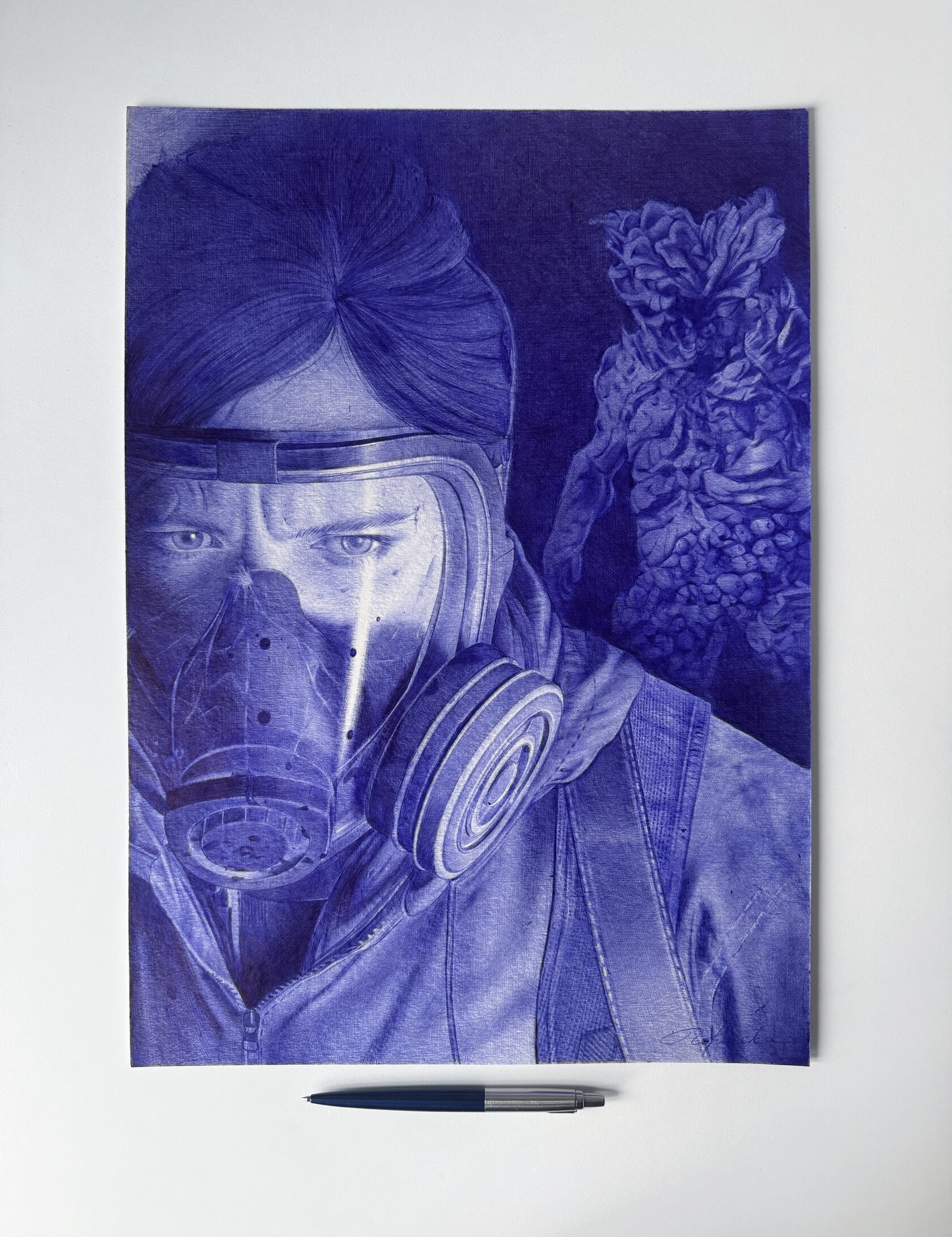 Портрет Элли Работа по мотивам игры "Одни из нас". Формат А3 (29,6 х 41,8см). Работа выполнена синей шариковой ручкой на бумаге плотностью 200г/м2. 2025г Оформлена в белую раму.