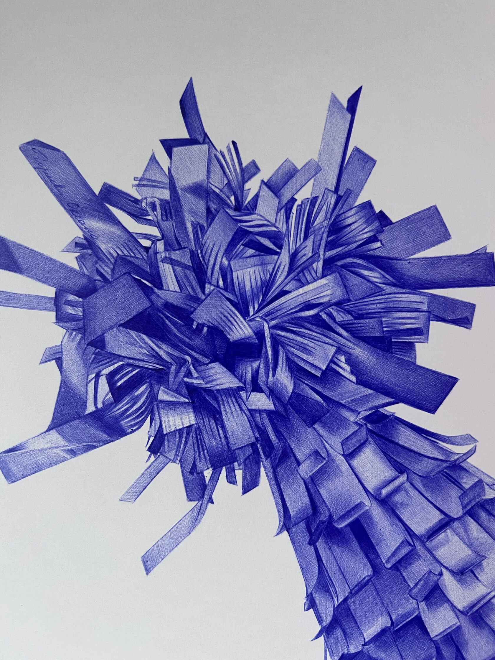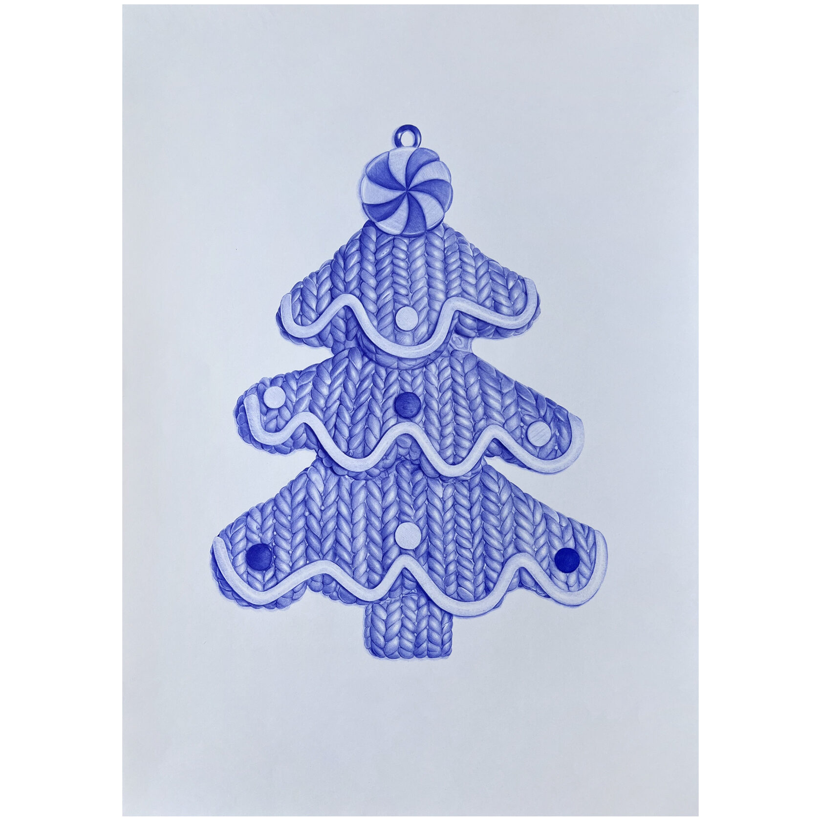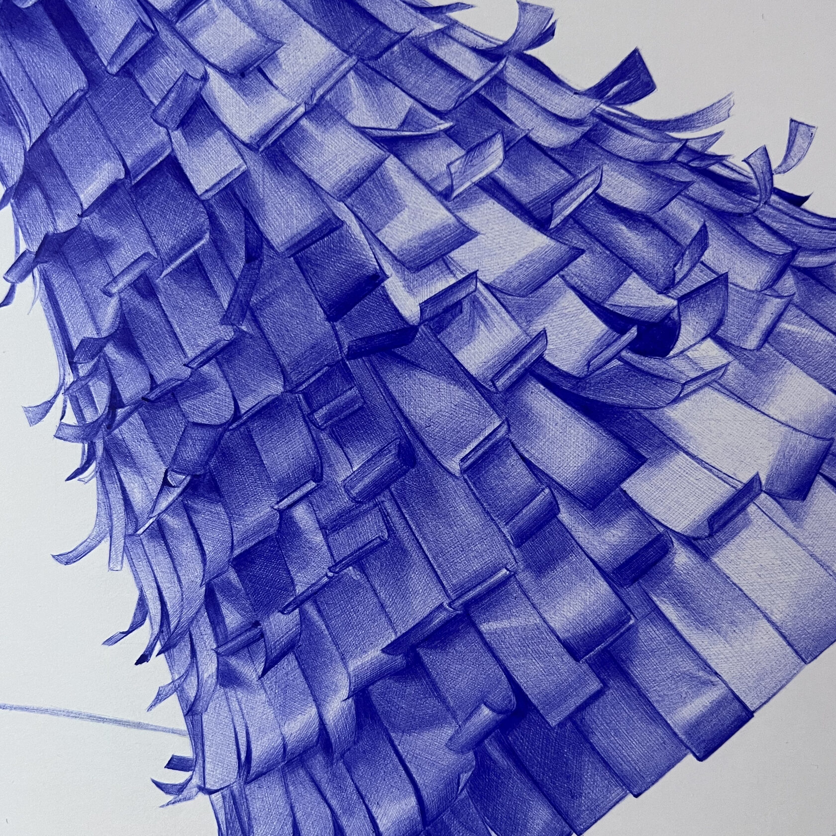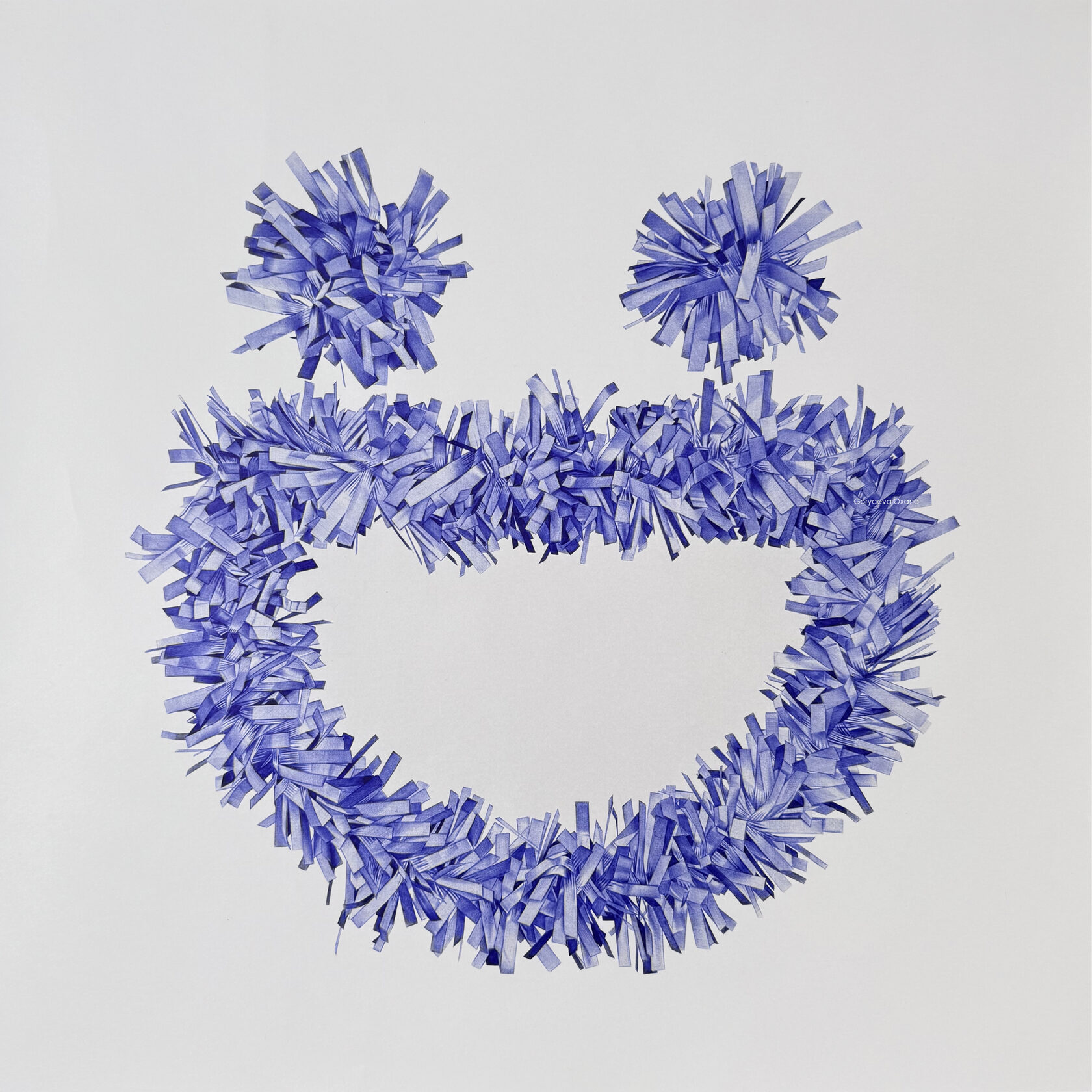 "Смех" В каждом блеске мишуры - кусочек воспоминаний. Здесь я собрала ее в форму эмоции, которую невозможно удержать) Смех — это вспышка: добрая, легкая, живая. Момент, в котором ты жив по-настоящему! А иногда одно воспоминание — и ты снова смеёшься, как тогда. 60х60см Серия «Эмоции» Работа выполнена синей шариковой ручкой на бумаге плотностью 200г/м2. 2025г Оформлена в белую раму.